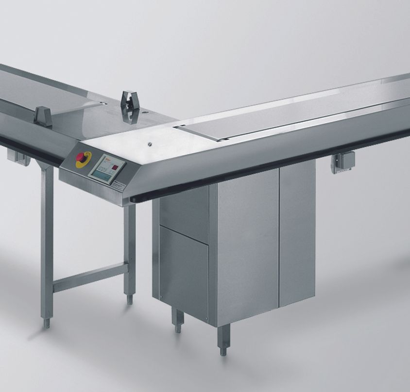 Gurtband ist ein weißes 2 mm dickes 3-schichtiges Band, 295 mm breit, lebensmittelbeständig und permanent antistatisch, serienmäßig mit Schmutzabstreifer.