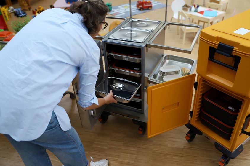 Durch den funktionalen Speisentransportwagen, können die vorproduzierten Speisen die in einer zentralen Cook & Chill-Küche gefertigt werden, direkt in kleinen Schulen oder Kindertagesstätten vor Ort optimal und einfach regeneriert oder á la minute fertig zubereitet werden, ohne lange Warmhaltezeiten. Hierdurch kann der Speiseplan mit vielfältiger Frische und saisonalen Gerichten gestaltet und wie im Restaurant mit á la Carte-Gerichten erweitert werden. Der Speisentransportwagen beheizt wie auch gekühlt, für noch mehr Funktionalität. Oben sowohl mit Abdeckung inklusive Rundrohrgalerie und/oder mit beheizten GN 1/1 Warmhaltewannen. Zuverlässig sowohl nass wie auch trocken beheizbar. Bei trockener Beheizung signifikante Energieeinsparung und geringerer Reinigungsaufwand der Wannen.