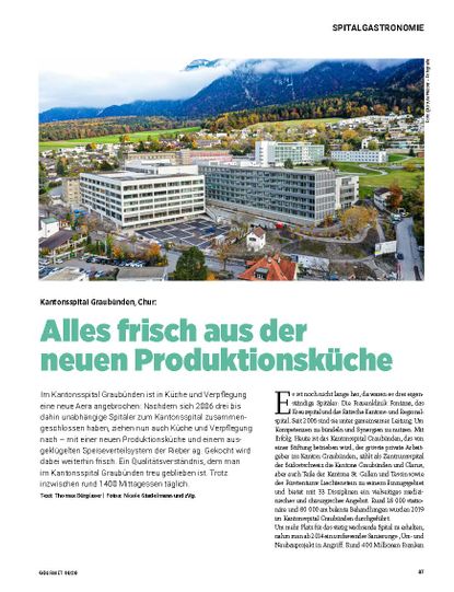 Im Kantonsspital Graubünden ist in Küche und Verpflegung eine neue Aera angebrochen: Nachdem sich 2006 drei bis dahin unabhängige Spitäler zum Kantonsspital zusammengeschlossen haben, ziehen nun auch Küche und Verpflegung nach – mit einer neuen Produktionsküche und einem ausgeklügelten Speiseverteilsystem der Rieber ag. Gekocht wird dabei weiterhin frisch. Ein Qualitätsverständnis, dem man  im Kantonsspital Graubünden treu geblieben ist. Trotz inzwischen rund 1400 Mittagessen täglich.