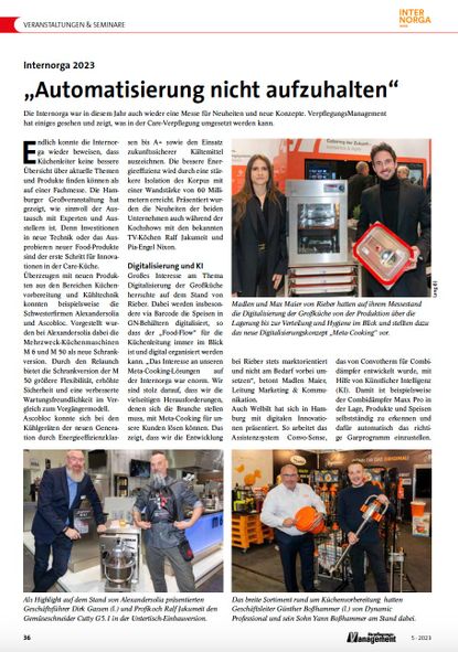 Digitalisierung und KI Großes Interesse am Thema Digitalisierung der Großküche herrschte auf dem Stand von Rieber. Dabei werden insbeson-dere via Barcode die Speisen in GN-Behältern digitalisiert, so dass der „Food-Flow“ für die Küchenleitung immer im Blick ist und digital organisiert werden kann. „Das Interesse an unseren Meta-Cooking-Lösungen auf der Internorga war enorm. Wir sind stolz darauf, dass wir die vielseitigen Herausforderungen, denen sich die Branche stellen muss, mit Meta-Cooking für un-sere Kunden lösen können. Das zeigt, dass wir die Entwicklung bei Rieber stets marktorientiert und nicht am Bedarf vorbei umsetzen“, betont Madlen Maier, Leitung Marketing & Kommunikation.