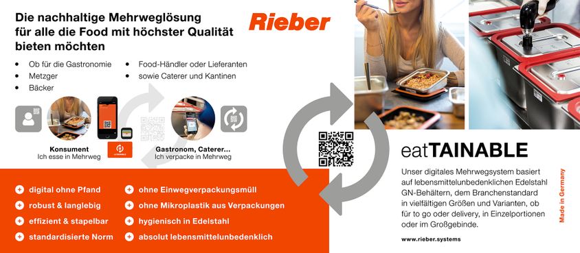 Durch die sichere Rieber Infrastruktur kombiniert mit der digitalen Mehrwegor-ganisation eatTAINABLE und der Lebensmittelsicherheit CHECK HACCP, alles digital organisiert über QR-Codes, kann die Unternehmensgruppe ein nach-haltiges und ressourcenschonendes Gesamtsystem abbilden, im Klein- und Großgebinde. Das System kann einfach über QR-Code Kleber in bestehende Infrastruktur nachgerüstet werden und bietet dadurch sowohl für Großküchen und -caterer, wie auch für die Kleingastronomie und den Handel eine nachhaltige Mehrweglösung. Hierbei wird der Behälter QR-Code nach dem Bücherei-Leihprinzip auf den Kunden verbucht, der ebenso einen eigenen individuellen QR-Code besitzt.