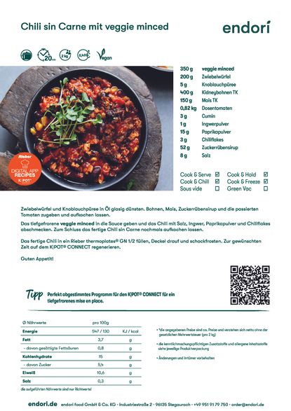 Begeistert von der einfachen Handhabung der Rieber CONNECT App, haben die Culinary Chefs von endori bereits Zubereitungsempfehlungen für viele Cook and Freeze Gerichte für unseren K|POT® CONNECT in Verbindung mit Rieber thermoplates® geschrieben. Die Programme reichen von Chili sin Carne mit endori veggie hack über Gemüsecurry mit endori veggie balls bis hin zu Geschnetzeltem mit endori veggie pulled und vielem mehr. Ein jeweils perfekt abgestimmtes Programm für ein tiefgefrorenes mise en place.