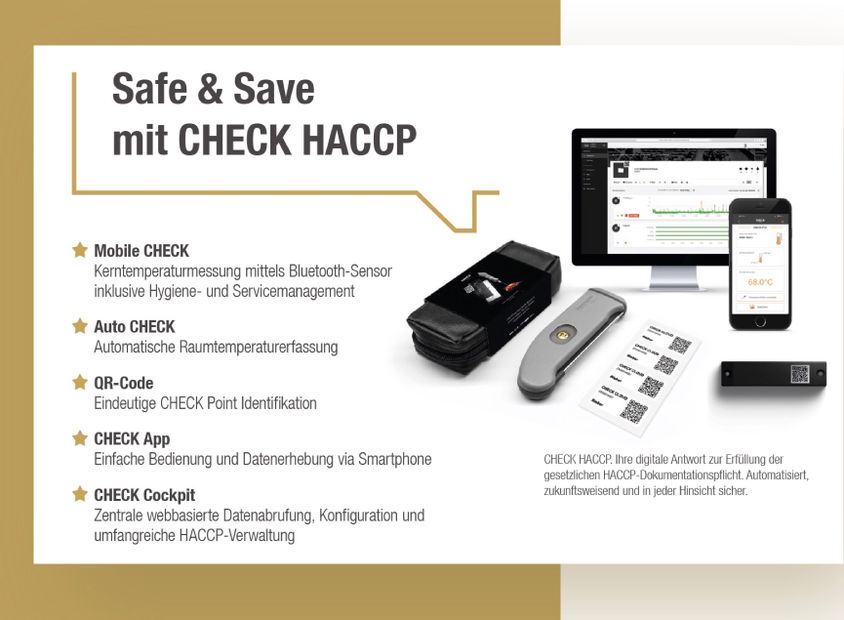 • Darüber hinaus digitale Food-Sicherheit mit dem einfach bedienbaren CHECK HACCP System, für Kern- & automatische Raumtemperaturmessung, sowie vielen weiteren Features (Mehrwegorganisation, Checklisten, Hygiene etc.)