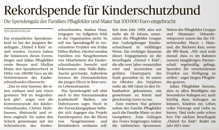 Mehr als 450 Gäste waren im vergangenen Oktober in die Event-Location „urbanharbor“ gekommen, um gemeinsam zu feiern und gleichzeitig Gutes zu tun – darunter auch einige bekannte Vertreter aus Wirtschaft und Politik. Neben Pflugfelder wurde die Benefizgala von Mann + Hummel, Bäckerei KATZ, BW Bank, maxmaier urbandevelopment, speisewerk und Rieber gesponsert. „Wir sind von der Höhe der Spendensumme überwältigt“, so Holtzhausen bei der Scheckübergabe. „Wir freuen uns, dass es nach wie vor viele Menschen gibt, die sich gerne für den guten Zweck einsetzen. Ihnen allen gilt daher mein persönlicher Dank.“